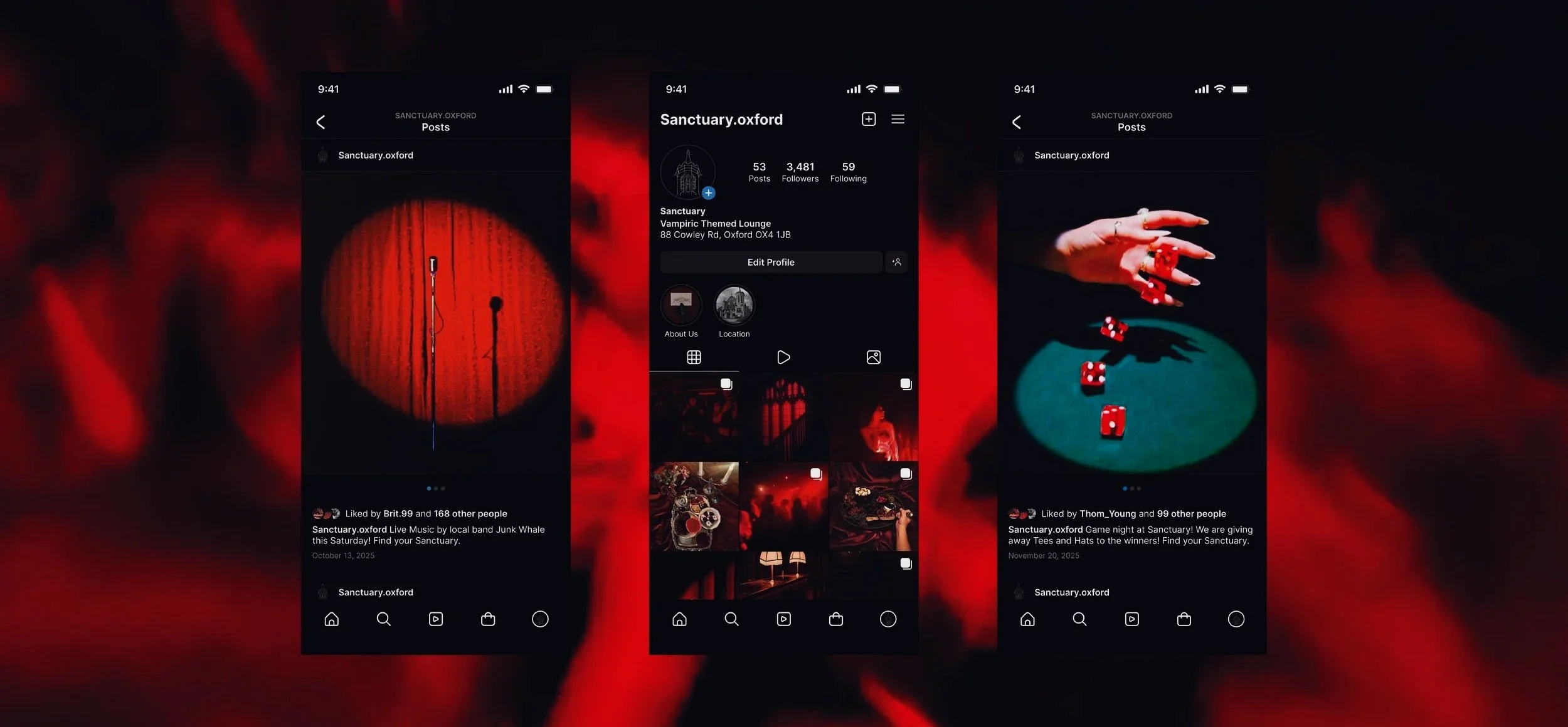 Sanctuary, located in Oxford, is a bar and lounge with a twist: a themed vampiric experience in a Gothic cathedral. Sanctuary includes musical numbers, theatrical actions, costumed staff and actors, and themed drinks and food.
